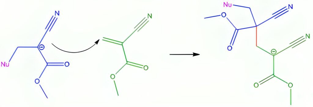 ¿qué hace que el superpegamento sea un adhesivo tan fuerte? La respuesta es sencilla: la polimerización de los monómeros de cianoacrilato da lugar a la formación de enlaces extremadamente fuertes. Los dos grupos que retiran electrones (el grupo ciano y el grupo éster) hacen que el doble enlace sea extremadamente vulnerable al ataque nucleofílico, y también hacen que el anión resultante sea extremadamente estable porque la carga negativa se extiende por toda la molécula. De ahí que los cianoacrilatos experimenten una polimerización extremadamente rápida a través de un mecanismo aniónico, como se muestra a continuación: