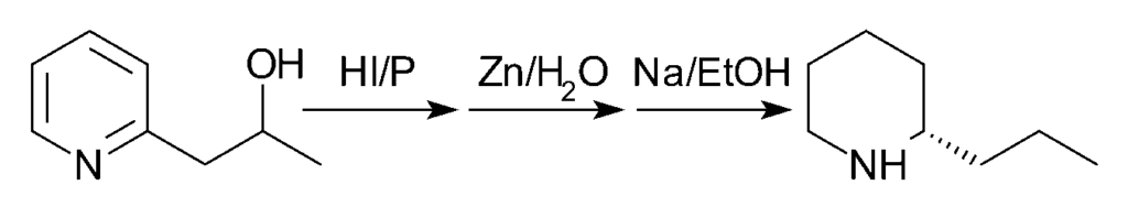 Nota: aunque el esquema siguiente muestra un solo enantiómero de coniína, la reacción final produce una mezcla racémica que luego se separa