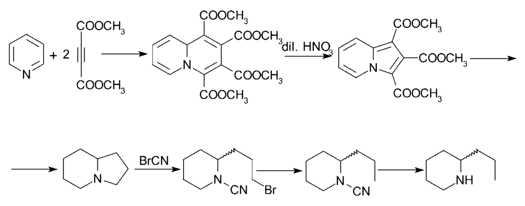 Nota: aunque el esquema que figura a continuación muestra un solo enantiómero de la coniína, la reacción final produce una mezcla racémica que luego se separa