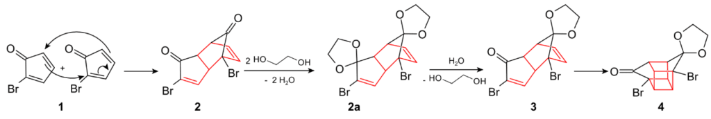 Este compuesto de partida (2-bromociclopentadienona) se dimeriza en un primer paso mediante una reacción de Diels-Alder a (2). Los dos grupos carbonilos de (2) están protegidos por el etilenglicol (2a). Posteriormente, el grupo endoacetal se hidroliza selectivamente para formar un compuesto (3). A esto le sigue una cicloadición [2+2] fotoquímica intramolecular a la bromocetona (4):