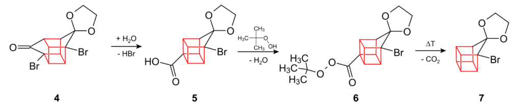 Por último, el grupo acetal restante también se hidroliza, la bromocetona (8) se reordena en una segunda reacción de Faworski y el ácido carboxílico resultante (9) se convierte en el correspondiente éster de ácido peroxicarboxílico (10). La molécula objetivo, el cubano (11), se obtiene después de la descarboxilación térmica de (10):