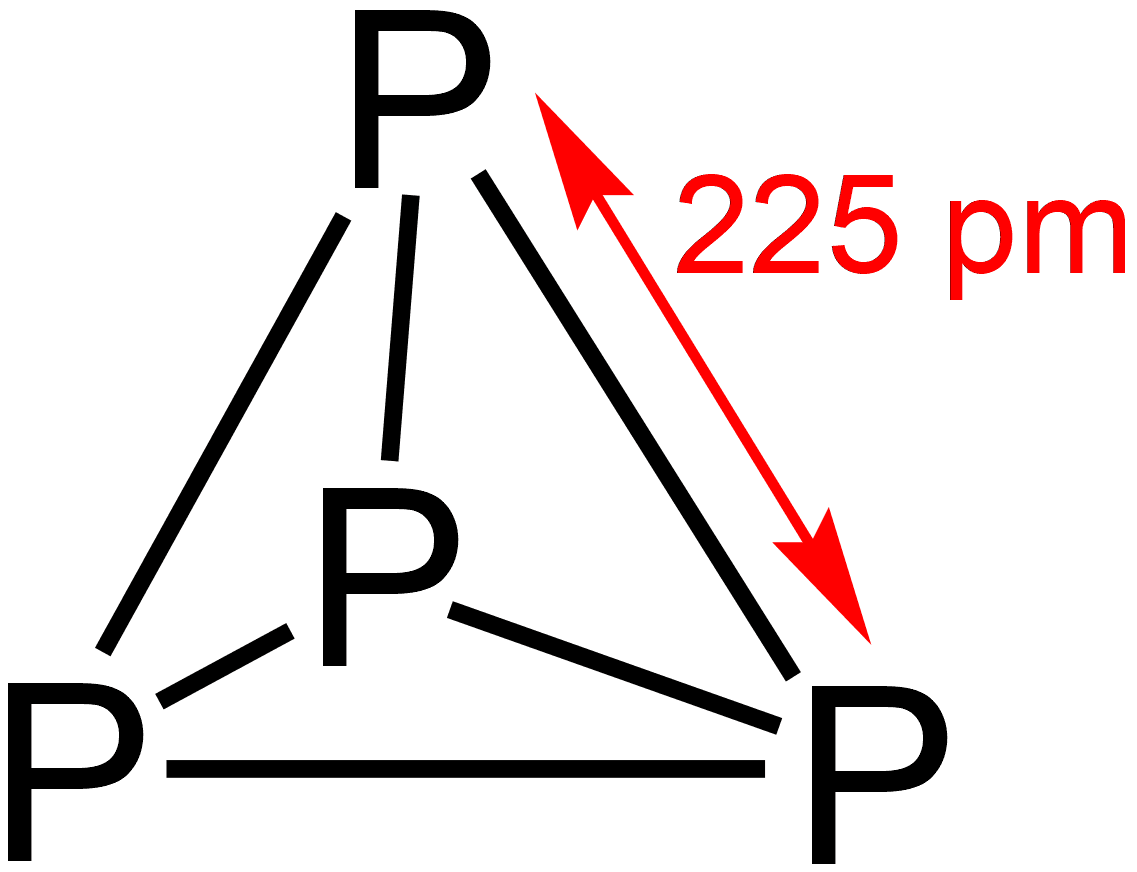 La molécula de fósforo blanco, , tiene una estructura tetraédrica. Los cuatro átomos de fósforo están unidos entre sí por enlaces covalentes simples. La geometría de un tetraedro regular impone que los ángulos de enlace P-P-P sean de 60°. Este ángulo es extremadamente agudo y se desvía drásticamente del ángulo de enlace ideal de ~109.5° para orbitales híbridos sp³.