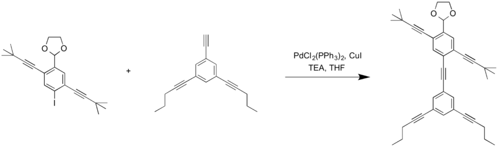 En este paso, la reacción de Sandmeyer convierte el grupo amino primario (NH2) en un grupo saliente de diazonio (N2), que posteriormente se sustituye por yodo. El yodo sirve como un excelente socio de acoplamiento para la unión de las patas, que se ejecuta a través del acoplamiento de Sonogashira con trimetilsilacetileno para producir 3,5-dibromo(trimetilsilletinil)benceno.