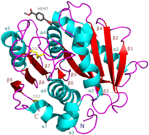 La PETasa exhibe características compartidas con lipasas y cutinasas, ya que posee un pliegue α/β-hidrolasa. Sin embargo, la hendidura del sitio activo en la PETasa es más abierta que en las cutinasas. La PETasa de **I. sakaiensis** es similar a la dienelactona hidrolasa, según Pfam, y de acuerdo con ESTHER, pertenece a la familia de las poliesterasas-lipasas-cutinasas.
