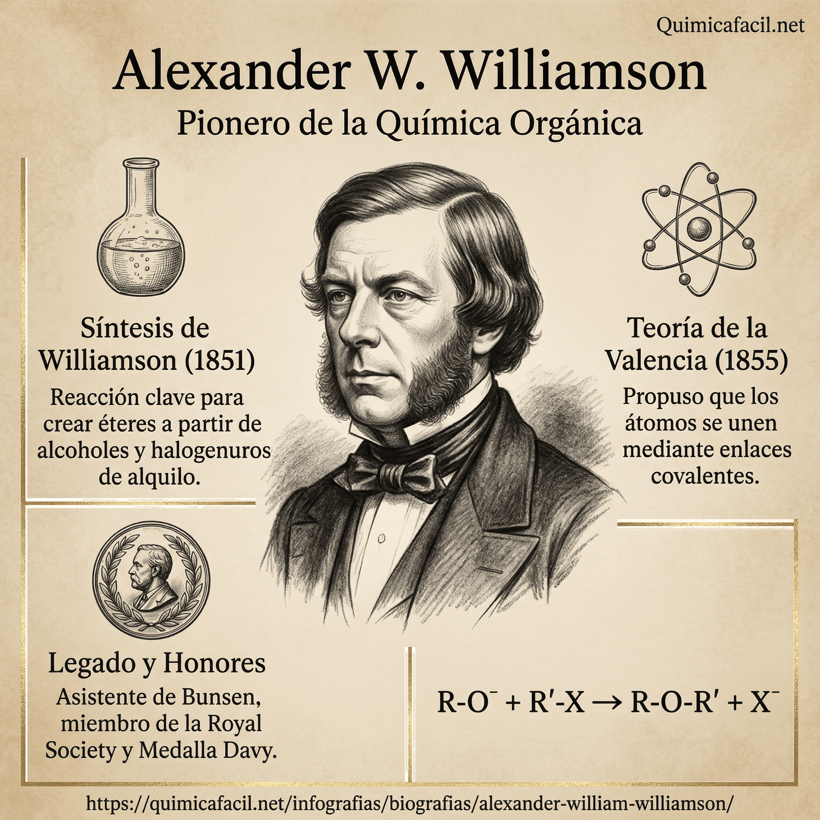 Alexander William Williamson fue uno de los químicos más importantes del siglo XIX, cuyo trabajo en la síntesis orgánica y la teoría de la valencia revolucionó la forma en que se entendía la química orgánica. Sus contribuciones han tenido un impacto duradero en la química y en otros campos, y su legado continúa siendo reconocido y valorado hoy en día.