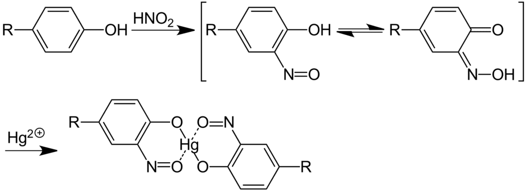 La reacción se debe a la formación de un compuesto nitro que a su vez genera un complejo de color rojo al reaccionar con un ion mercurio (II). Si se adiciona una gran cantidad de reactivo, puede generarse una coloración amarilla que no es indicativa de reacción positiva.
