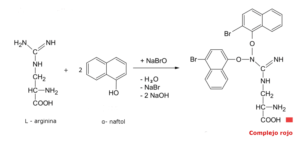 La arginina reacciona en medio básico con α- naftol en presencia del ion hipobromito generando un complejo de color rojo.