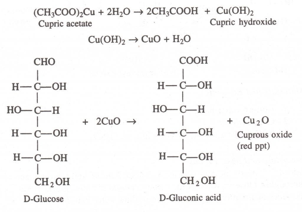 El reactivo de Barfoed consiste en una solución 0.33 M de acetato de cobre (II) en una solución de acido acético al 1% preparado en fresco. El acetato de cobre se hidroliza dando hidróxido de cobre (II) que se deshidrata a oxido de cobre (II). El óxido cúprico reacciona con el azúcar generando el ácido orgánico correspondiente y un precipitado de óxido de cobre (I).