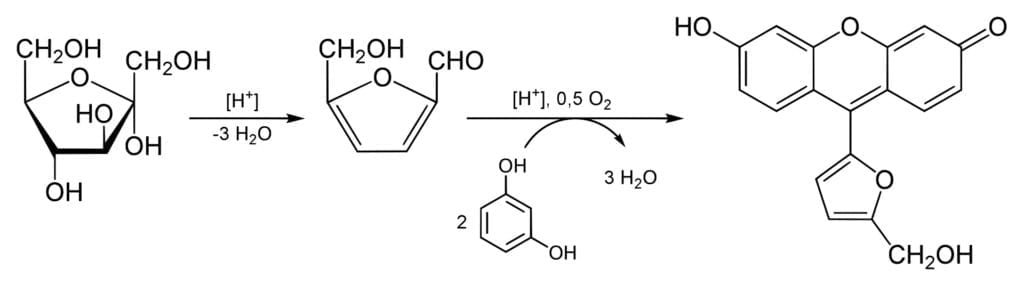 Por ultimo se aplica el ensayo de Seliwanof, que se emplea para diferenciar entre aldosas y cetosas. El fundamento químico del ensayo es que las cetosas al ser calentadas en un medio acido, se deshidratan más rápido que las aldosas, y reaccionan con dos equivalentes de resorcinol para producir una molécula de color rojo cereza, indicativo de reacción positiva