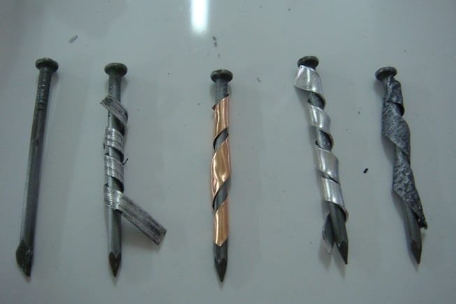 Lavar y limpiar seis puntillas de hierro, lijando suavemente su superficie. A dos de las puntillas enrollar con alambre de cobre y otras dos puntillas, enrollarlas con cinta de magnesio.