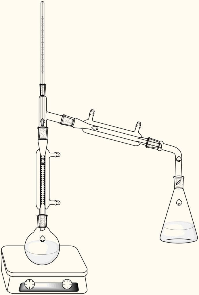 La cabeza del destilado se recoge desde el inicio de la aparición de este hasta cerca de los 70°C, almacenar. El cuerpo del destilado se recoge entre 70 y 90°C, cuando se alcance dicha temperatura se puede suspender el calentamiento.