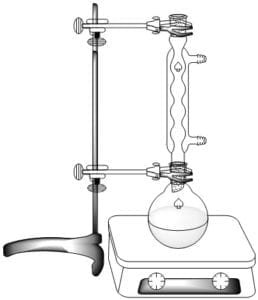 Agregar unos trocitos de porcelana o esferas de vidrio y realizar el montaje de reflujo como se muestra en la figura. Dejar en reflujo por 30 minutos.