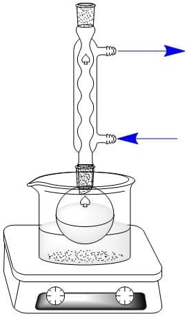 En un balón de fondo redondo de 100 mL colocar 7 g de plomo en granallas, 15 mL de ácido nítrico y 30 mL de agua. Realizar el montaje de reflujo con calentamiento a baño de María con aceite mineral que se muestra a continuación y calentar con agitación hasta la desaparición del plomo.