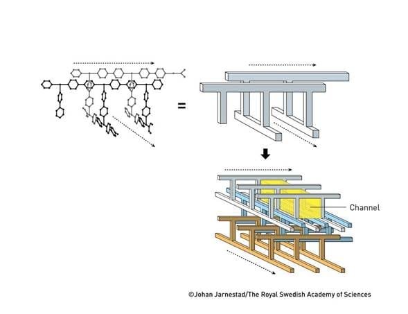 Sin embargo, no se rindió y en 1997 tuvo su primer gran avance. Usando iones de cobalto, níquel o zinc y una molécula llamada 4,4′-bipiridina, su grupo de investigación creó estructuras metal-orgánicas tridimensionales que estaban atravesadas por canales abiertos (figura 3). Cuando secaron uno de estos materiales —vaciándolo de agua—, era estable y los espacios incluso podían llenarse con gases. El material podía absorber y liberar metano, nitrógeno y oxígeno, sin cambiar de forma.