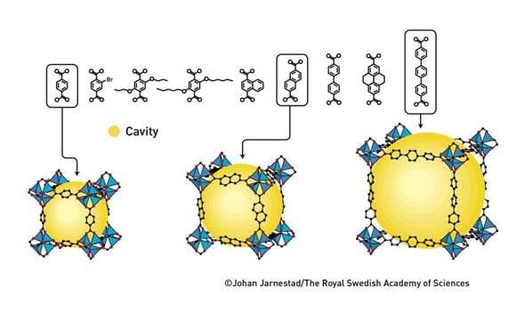 Omar Yaghi sentó los últimos ladrillos en la fundación de las estructuras metal-orgánicas en 2002 y 2003. En dos artículos, en Science y Nature, muestra que es posible modificar y cambiar las MOF de manera racional, dándoles diferentes propiedades. Una de las cosas que hizo fue producir 16 variantes de MOF-5, con cavidades que eran tanto más grandes como más pequeñas que las del material original (figura 6). Una variante podía almacenar enormes volúmenes de gas metano, que Yaghi sugirió que podría usarse en vehículos impulsados por GNR (gas natural renovable).