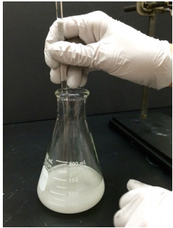- En la campana extractora, vierta el adsorbente medido en la columna en un matraz Erlenmeyer (Figura 3b), y luego añada un poco de eluyente (Figura 3c). Haga una lechada suelta girando y agitando con una varilla de vidrio (Figura 3d) hasta que todo el adsorbente esté completamente mojado, se liberen burbujas de gas y la consistencia sea algo espesa pero vertible.