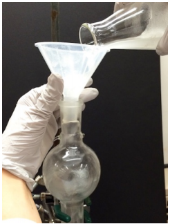 - Ponga un vaso de precipitados o un matraz Erlenmeyer bajo la columna de sujeción y abra la llave de paso. En un rápido movimiento, se gira y se vierte la lechada de sílice o alúmina en la columna usando un embudo de boca grande (Figura 4a). Inmediatamente utilice más eluyente para enjuagar la lechada residual del matraz Erlenmeyer (Figura 4b) y para que llegue a la columna.