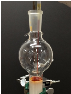 - Ponga la columna boca abajo sobre un gran vaso de residuos en la campana extractora, para que el adsorbente caiga cuando se haya secado (Figura 14b). Esto llevará mucho tiempo (hasta el próximo período de clases), pero es una opción.