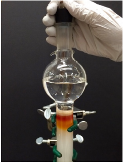 - Asegure su columna perfectamente vertical a un soporte de anillo o enrejado, sujetándola con abrazaderas de tres dedos en dos lugares. En la campana extractora, vierta gel de sílice o adsorbente de alúmina en la columna a una altura de entre 5 y 6 pulgadas (Figura 3a).