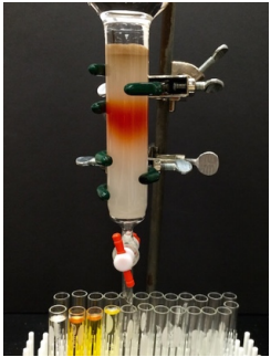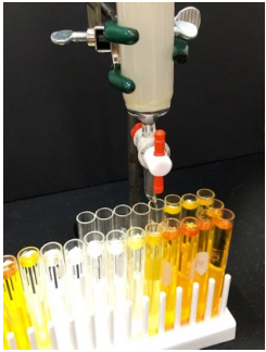 En la columna que se muestra en esta sección, el componente con el Rf más bajo (naranja en la placa de TLC en la Figura 11a), es el componente recogido en segundo lugar de la columna.